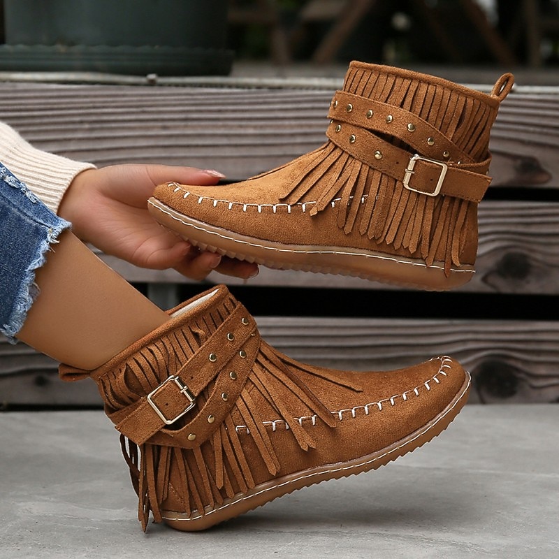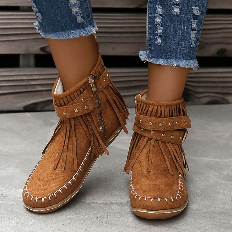 HOT ! Women's Suede Fringe Moccasin Ankle Boots – Boho Flat Boots with Studded Strap for Fall Outfits, Daily Walking & Outdoor Casual Looks