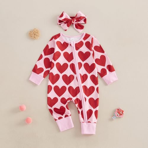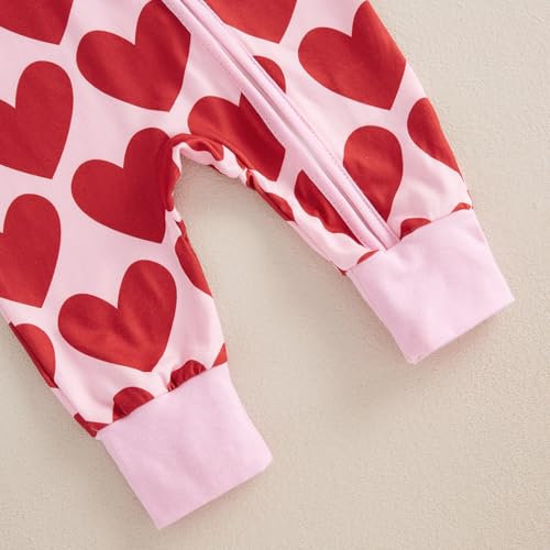 • Valentines Baby Girl Outfit: Infant toddler girls jumpsuit features heart print, round neck, long sleeve, full length and zipper front design, newborn valentines onesie girl makes your princess so cute and eye-catching in the crowd
