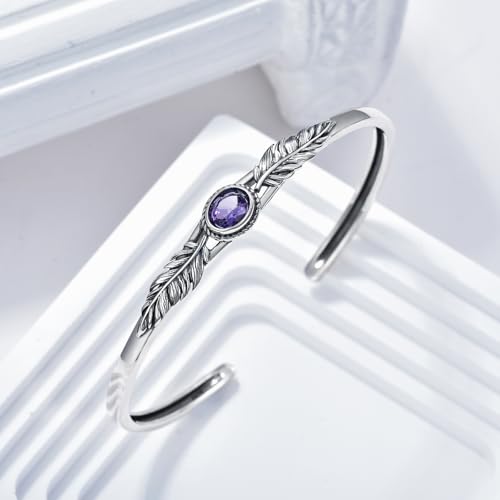 HOT ! Amethyst Feather Cuff Bracelet Sterling Silver Adjustable Vintage Bangle, Bohemian Jewelry February Birthstone Gift for Her