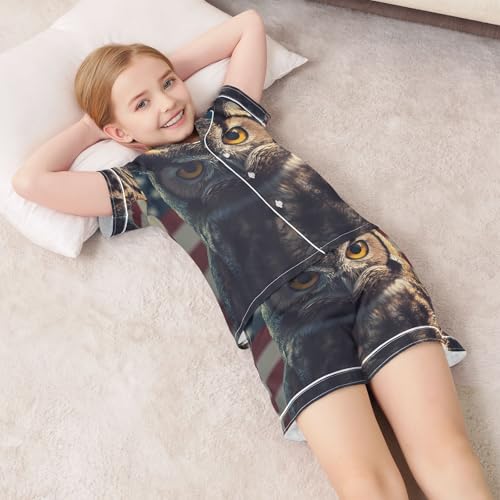 ALAZA Funny Owl American Flag Satin Pajamas Set Short Sleeve Button Down Sleepwear Summer Pjs 2 Piece 1