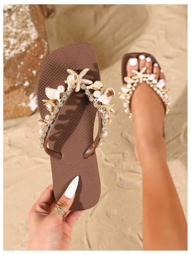 GORGLITTER Women's Rhinestone Flip Flops Shell Summer Sandals Open Toe Thong Beach Sandals 5