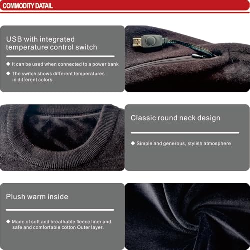 • QUALITY FABRIC & FLEECE LINING: Quality fabric makes the heated sweater soft and durable. Excellent craftsman allows sweaters to be machine or by hand washable and shrink-free. while retaining its original form and ensures you don't lose any excess heat and enjoy comfortable warmth.