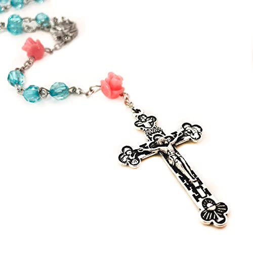 • Beautiful Turquoise and Pink Rose Rosary by Catholic Heirlooms. Includes a velvet pouch and a Prayer Card.