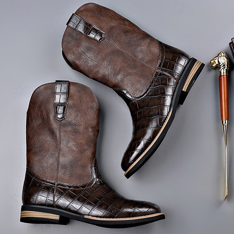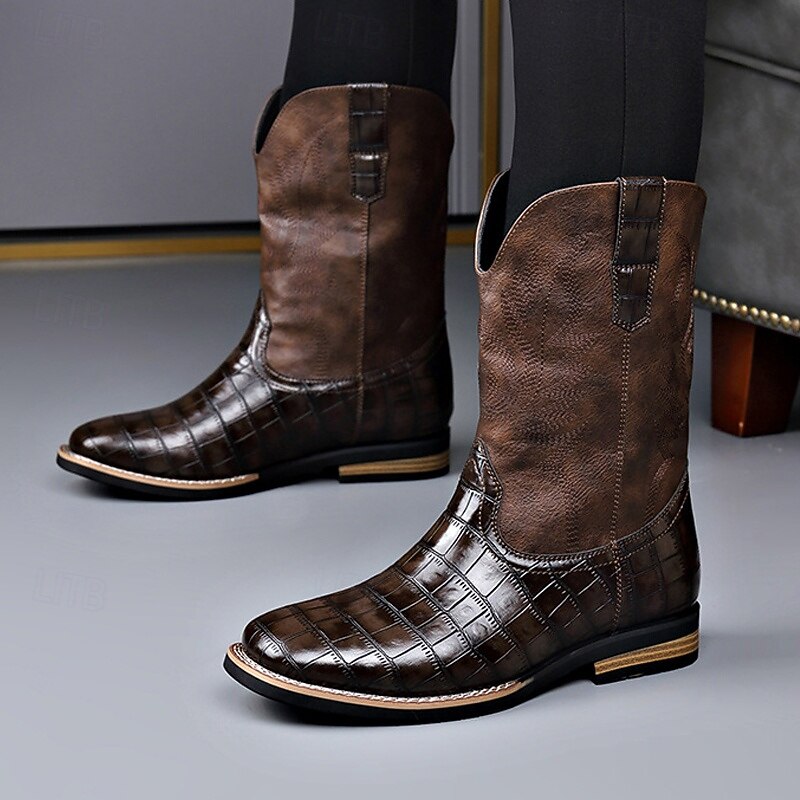 HOT ! Men's Brown Faux Leather Crocodile Print Western Boots – Exotic Cowboy Style Footwear for Casual and Country Events