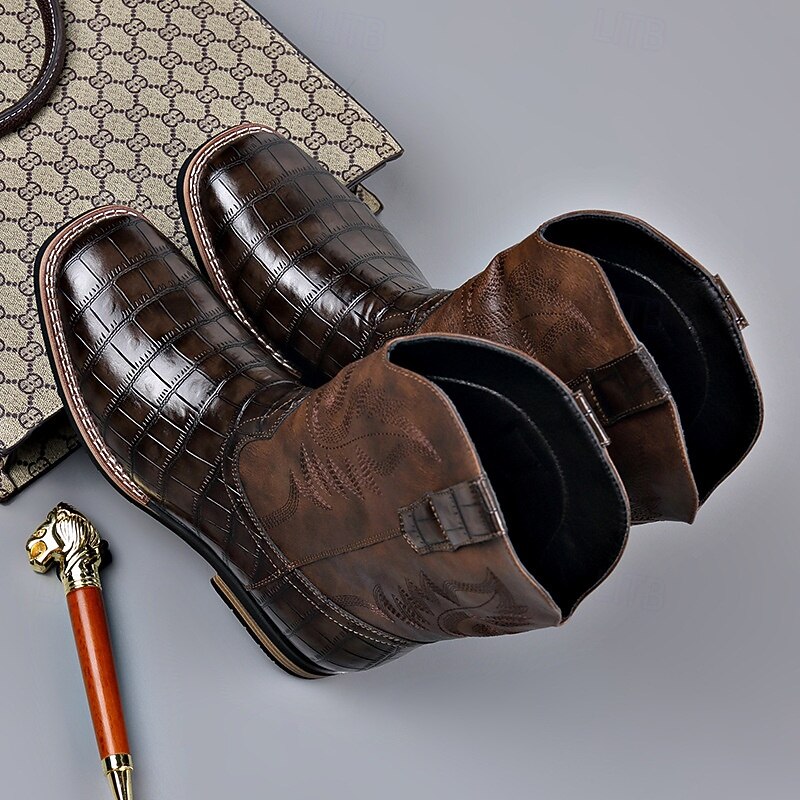 Men's Brown Faux Leather Crocodile Print Western Boots – Exotic Cowboy Style Footwear for Casual and Country Events 1