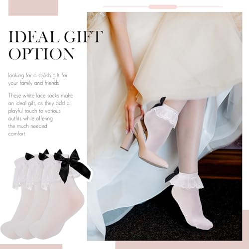 3 Pairs Women's White Lace Ruffles Bobby Frilly Socks with Black Bow, White Ruffled Anklet Socks Women with Bows for Skirts 4