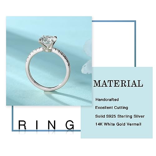 • MATERIAL: Encircling the finger with a row of shimmering light, this beautiful solitaire engagement ring features AAAAA+ cubic zirconia pave set in delicately sculpted prongs reaching half of the way around the 14K White Gold Vermeil band. The 2ct D Color VVS1 Clarity Lab Creted Moissanite center gem is secured in a classic setting and appears to float above the delicate band.