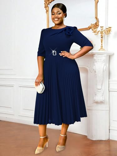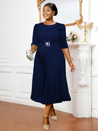 AOMEI Women's Green Crewneck Half Sleeve with Flower Buckle Pleated A-Line Work Dress 5