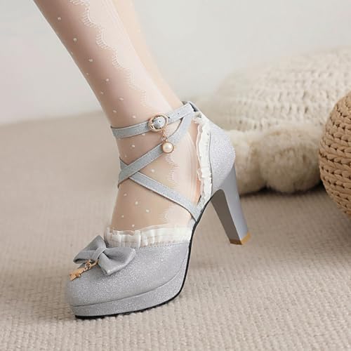 Women's Glitter Chunky High Heels Mary Jane Pumps Shoes Round Toe Platform Bow Lolita Party Dress Shoe 6