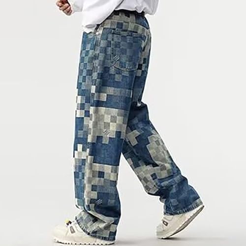 HOT ! Plus Size Baggy Jeans Men Relaxed Fit Wide Leg Straight Pants,Mosaic Plaid Print Y2K Hip Hop Street Trousers