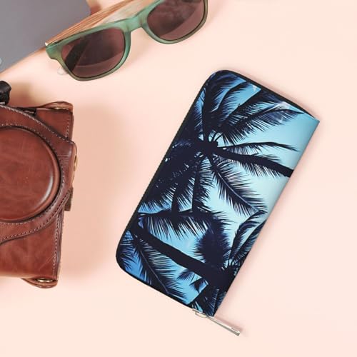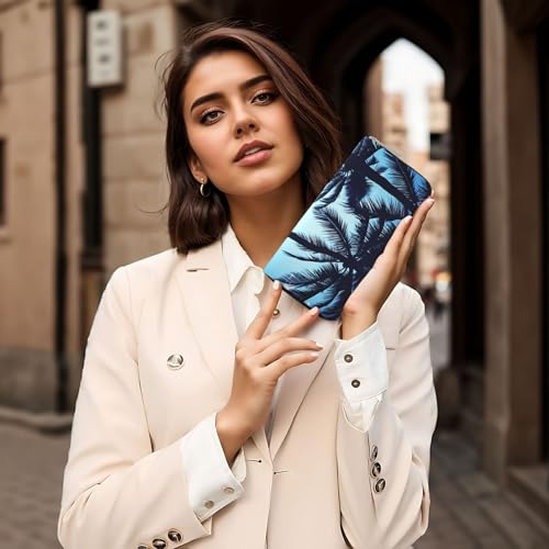 HOT ! Palm Tree Blue Leather Wallet For Women Girl, Zip Around Credit Card Holder Long Pu Wallet Clutch Purse Waterproof Travel Handbag