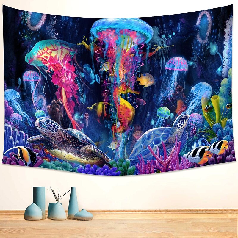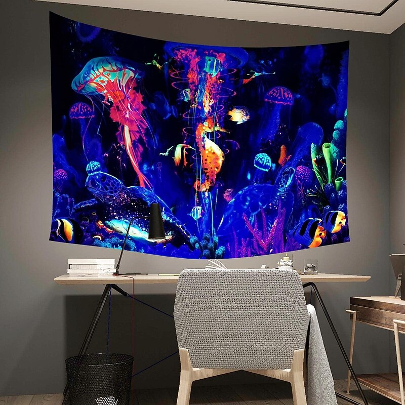 HOT ! Blacklight Tapestry UV Reactive Glow in the Dark Glow Party Neon Jellyfish Marine Psychedelic Trippy Misty Hanging Tapestry Wall Art Mural for Living Room Bedroom