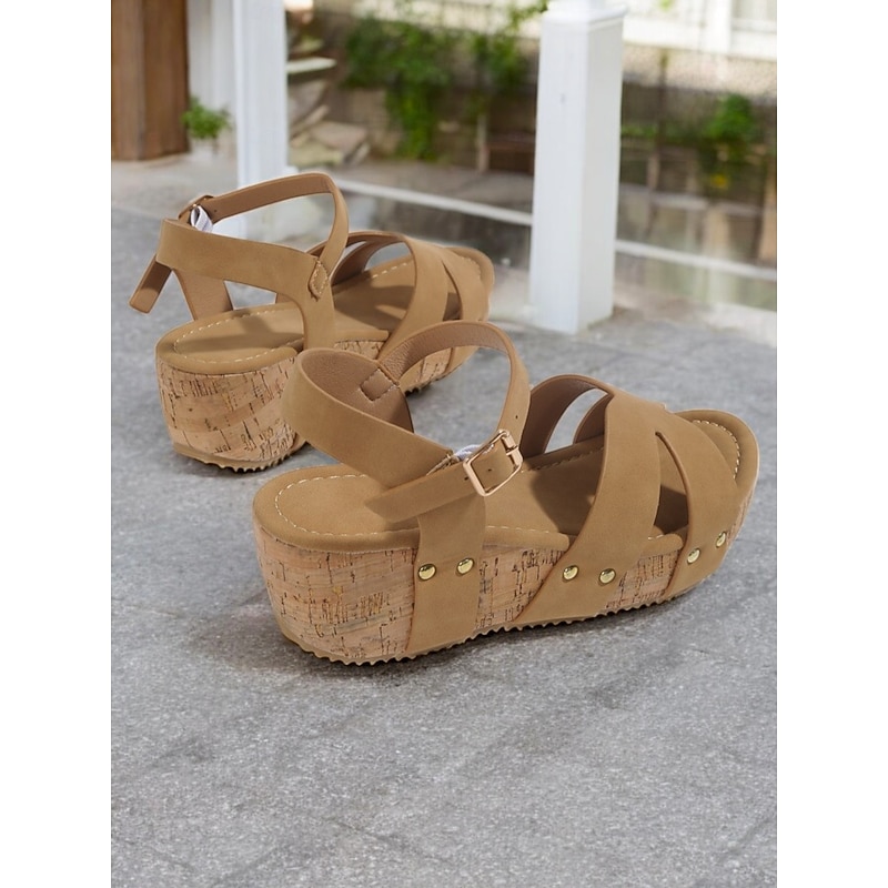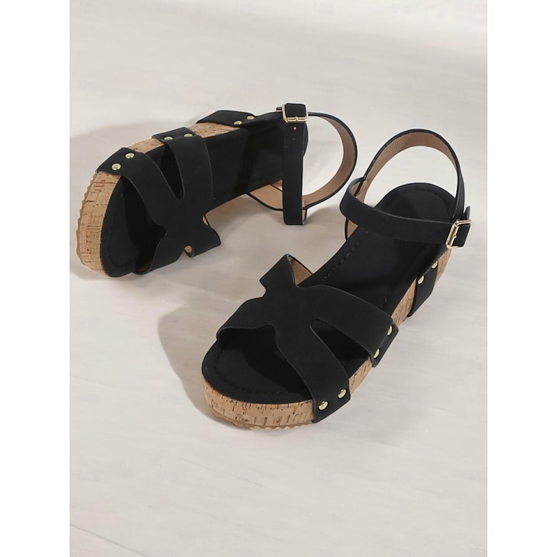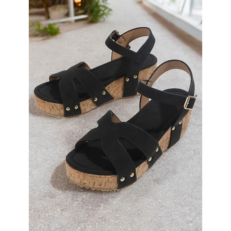 HOT ! Women's Black Cork Platform Sandals with Cross-Strap Design and Buckle Closure, Casual Wedge Shoes for Summer Beach and Daily Wear