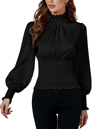 HOT ! LYANER Women's Shirred Frill Mock Neck Smocked Puff Long Sleeve Blouse Top