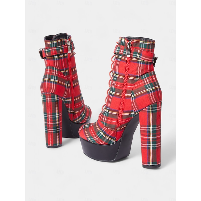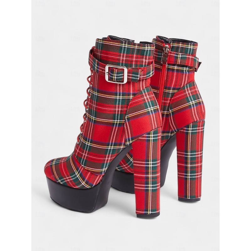 Highlights [Fabric] Crafted from durable cloth, these Women's Red Tartan Platform Ankle Boots feature a classic red, green, and yellow plaid pattern that perfectly combines vibrant style with long-lasting wear. [Silhouette] The boots boast a chunky block heel and a platform sole, offering both height and comfort. The elegant round toe design adds a touch of sophistication to this bold fashion piece. [Design Highlights] The standout lace-up front with adjustable buckle straps around the ankle adds a unique blend of punk and retro aesthetics. The convenient side zipper allows for easy on and off, making these boots as practical as they are stylish. [Occasion] Versatile and fashionable, these ankle boots are perfect for daily wear across all seasons—spring, summer, fall, and winter. Whether you're dressing up or keeping it casual, they make a strong statement and complement a wide range of outfits. [Size] Available in a choice of sizes: US6 to US10.5 (EU36 to EU42), these boots are designed to fit true to your usual size, ensuring a comfortable and flattering fit for all-day wear.