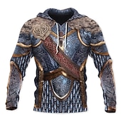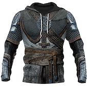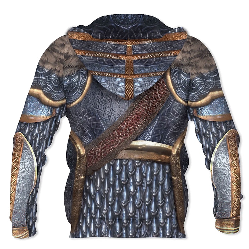 : This hoodie stands out with its graphic prints inspired by medieval armor, combining intricate patterns with metallic grey and deep red hues. The 3D print technology used in the design simulates the appearance of detailed ironwork and leather, making it a striking choice for cosplay or themed events.