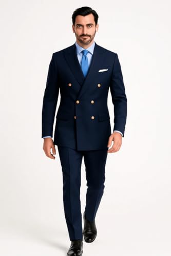 • Classic double-breasted (6×2) front with gold buttons Tailored/modern fit; clean shoulder line and trim waist Peak lapels, flap pockets, welt chest pocket Back vents for easy movement; fully/half-lined interior Smooth, wrinkle-resistant suiting with a refined drape Versatile navy pairs with dress trousers, chinos, or denim Fit: Tailored (order true to size; size up for layering) Care: Dry clean; steam to refresh between wears