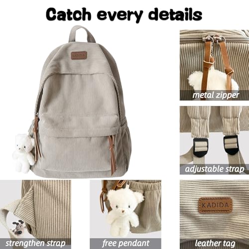 Teclado Kawaii Backpack with Cute Accessories Corduroy Casual Bookbags with Pendants Lightweight Laptop Bag Travel Daypacks (Grey) 4