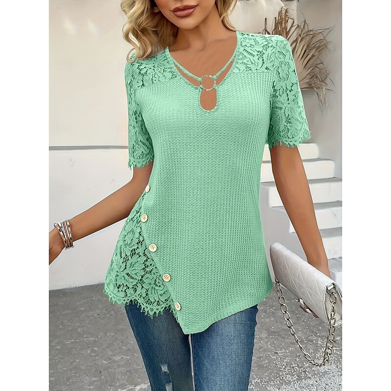 Highlights - Perfect for summer with short sleeves - Designed for women looking for a stylish and casual look - Ideal for daily wear - Features a solid color pattern, lace design, and button accents - Flattering V neck neckline for a trendy touch