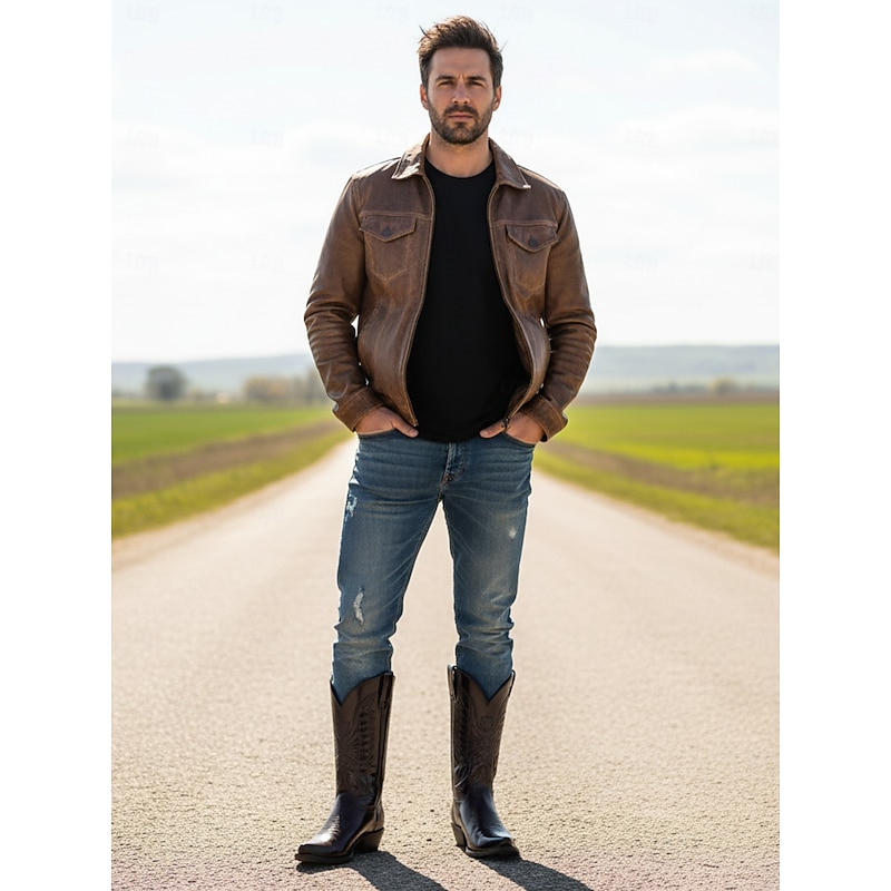 Men's Classic Brown Faux Leather Western Cowboy Boots - Embossed Pattern, Pointed Toe, and Mid-Heel for Rodeo, Ranch, and Casual Wear 1