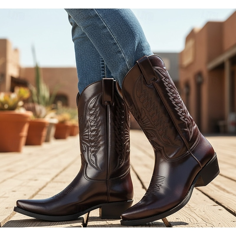 Men's Classic Brown Faux Leather Western Cowboy Boots - Embossed Pattern, Pointed Toe, and Mid-Heel for Rodeo, Ranch, and Casual Wear 6