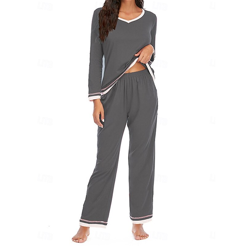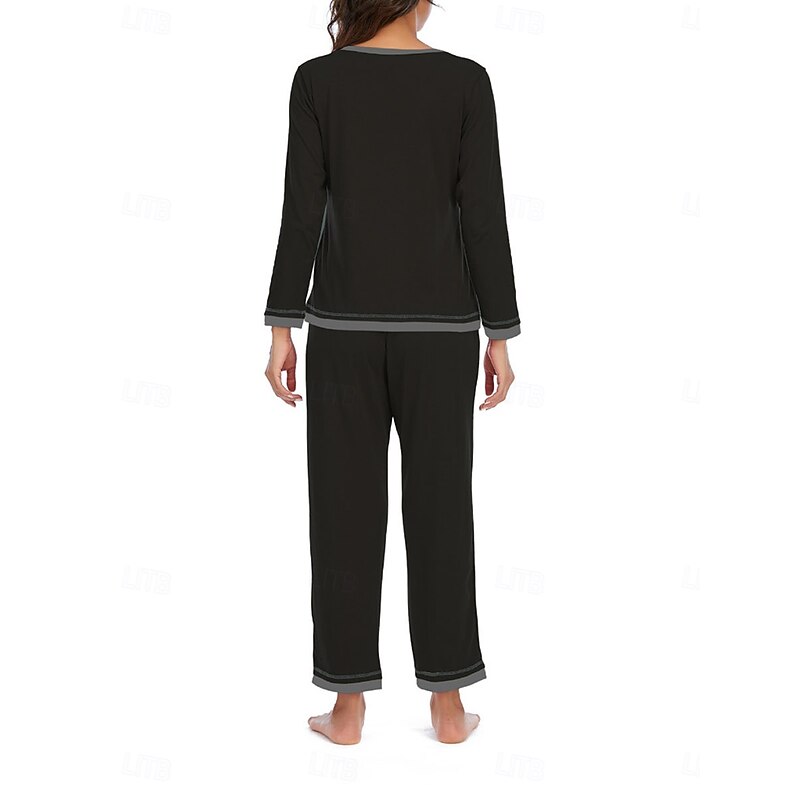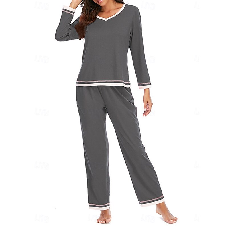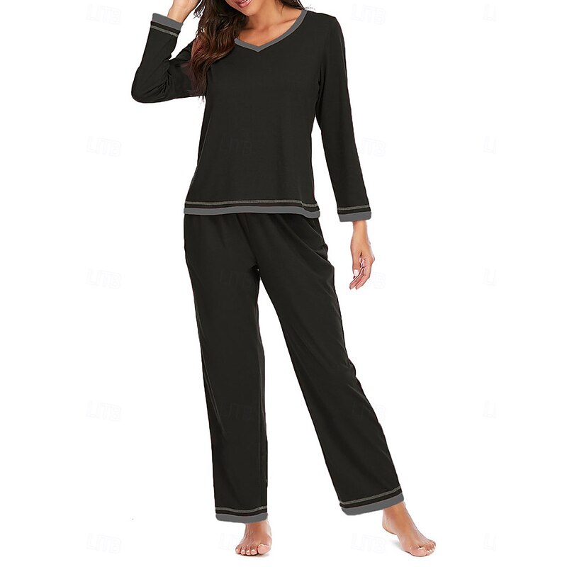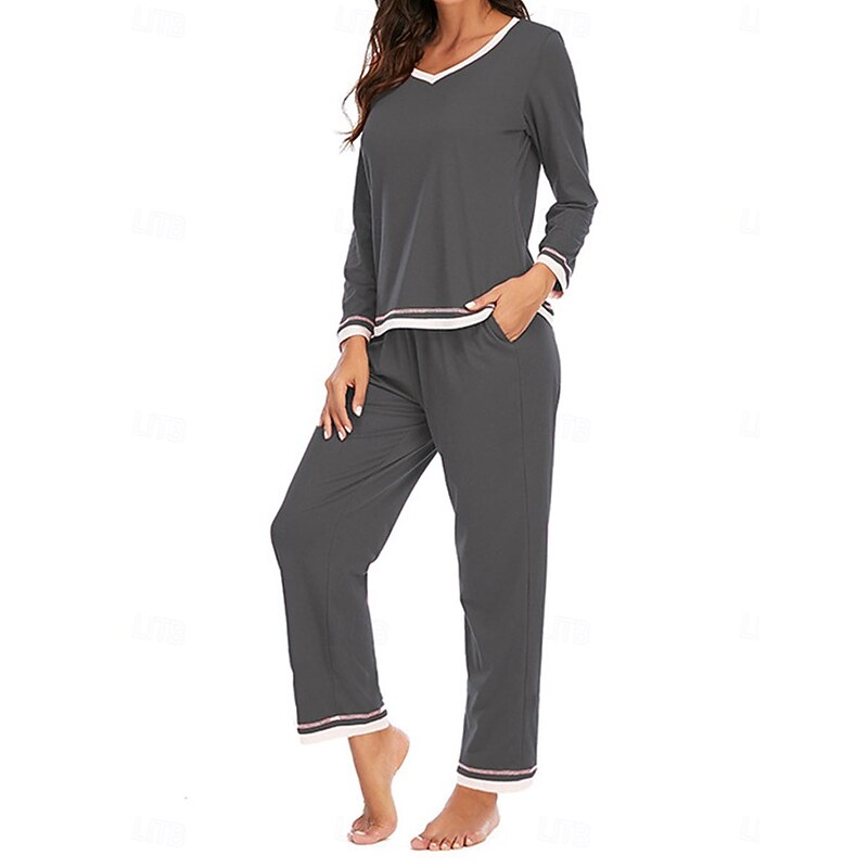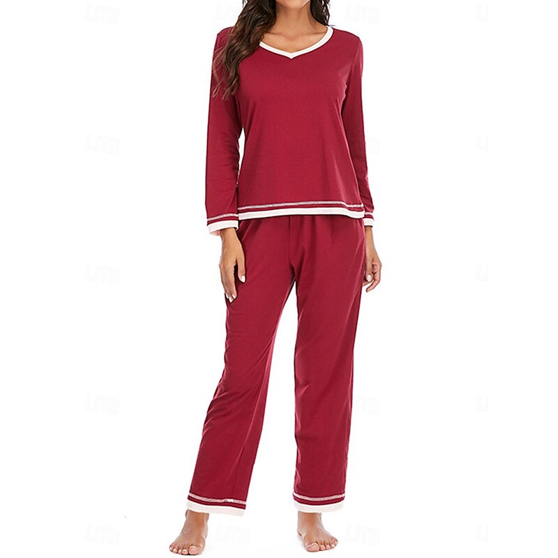 : This two-piece set stands out with its rich burgundy color, contrasted by white trim detailing along the neckline, cuffs, and hem. The clean lines and simple elegance of this design bring a stylish touch to your home wear.
