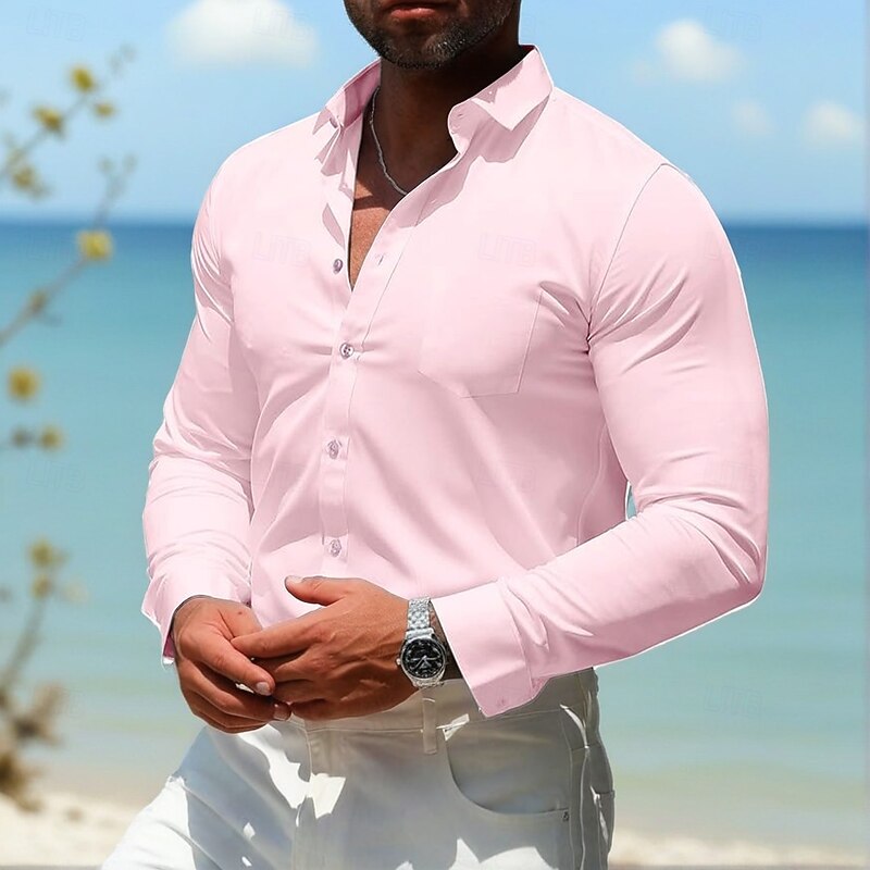 HOT ! Men's Casual Summer Shirt Homecoming Standard Fit Long Sleeve Lapel Solid Color Polyester Black White Pink 2025