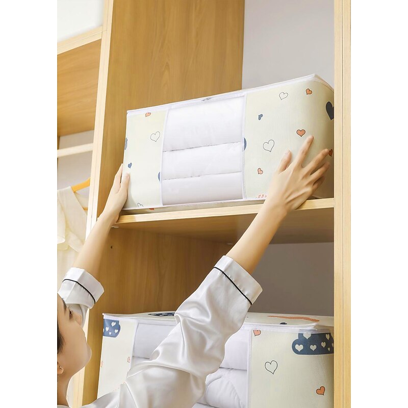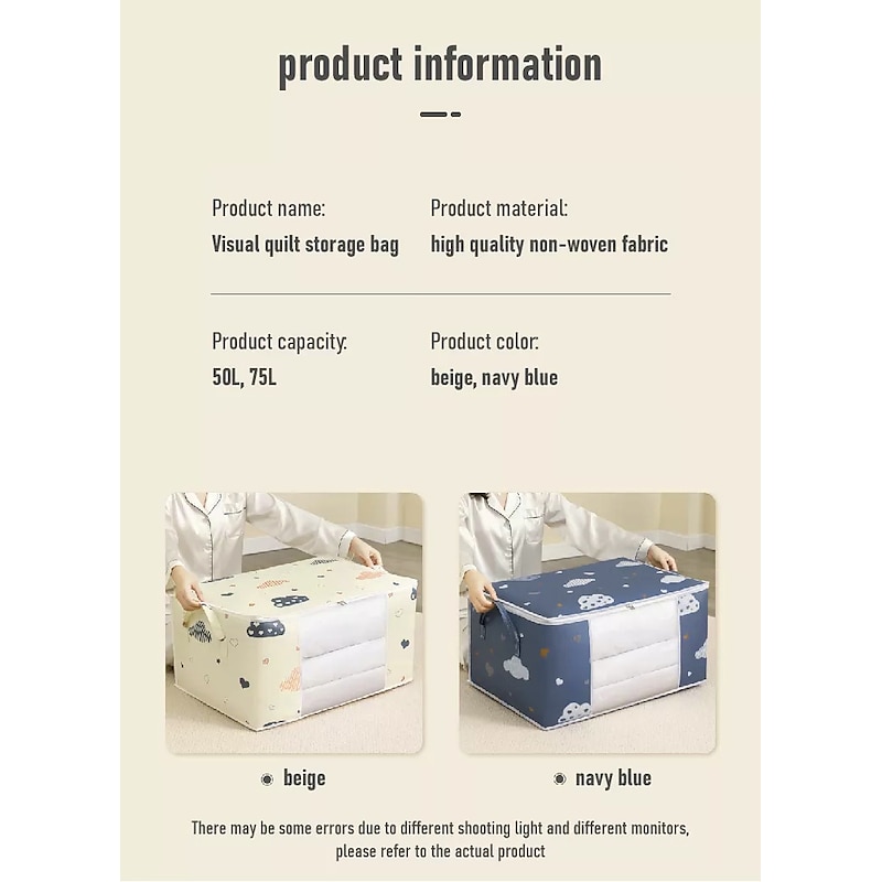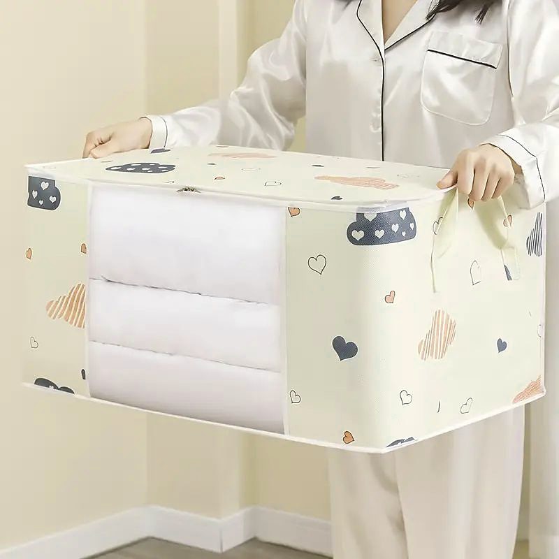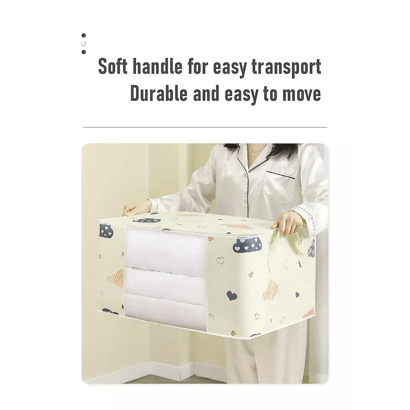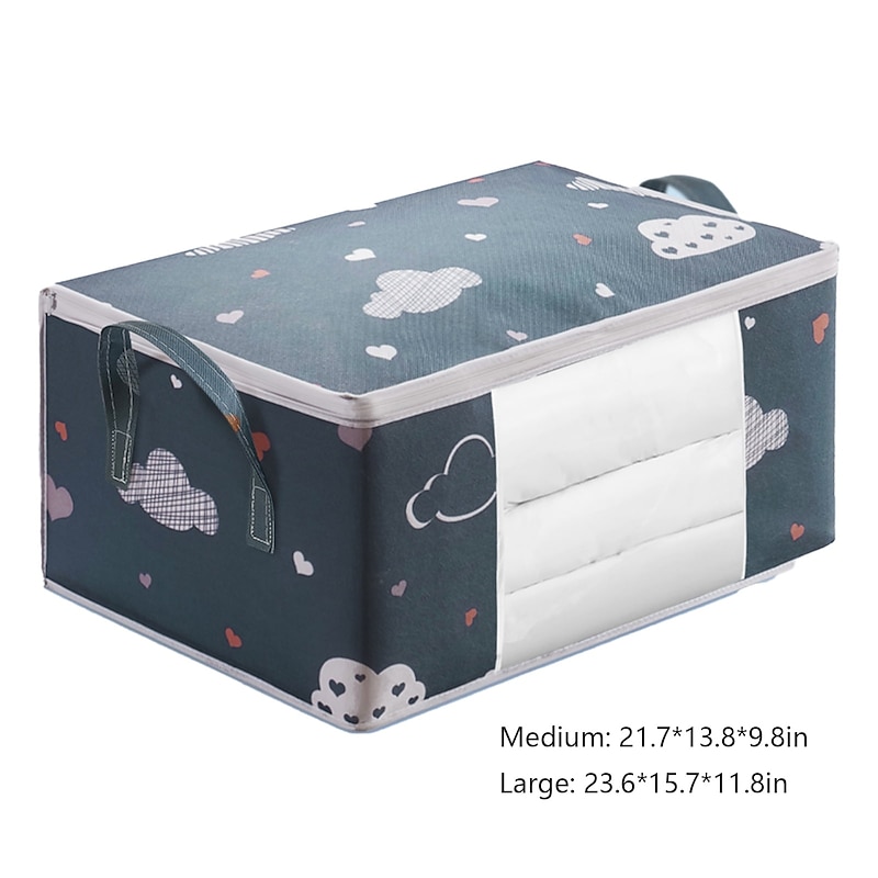 Highlights - Easy storage and transport: Foldable and portable design allows for easy storage and transportation. - Stylish and versatile: Available in a range of stylish colors, perfect for use in various locations. - Spacious and convenient: Large capacity for storing blankets, bedding, and other items. - Durable and sturdy: Reinforced handle and sturdy zipper for secure carrying and storage. - Clear window: Clear window for easy visibility of contents.