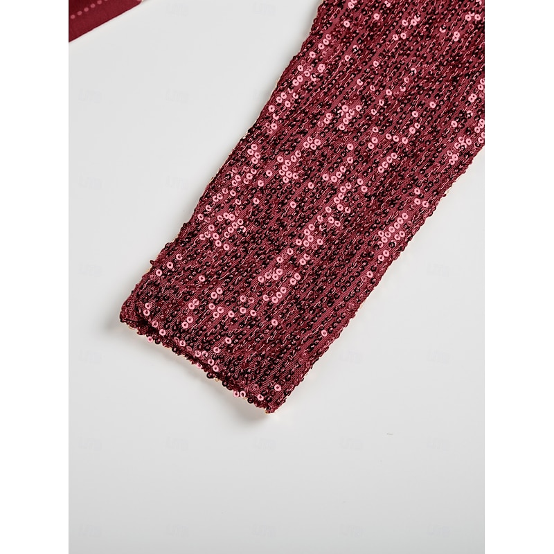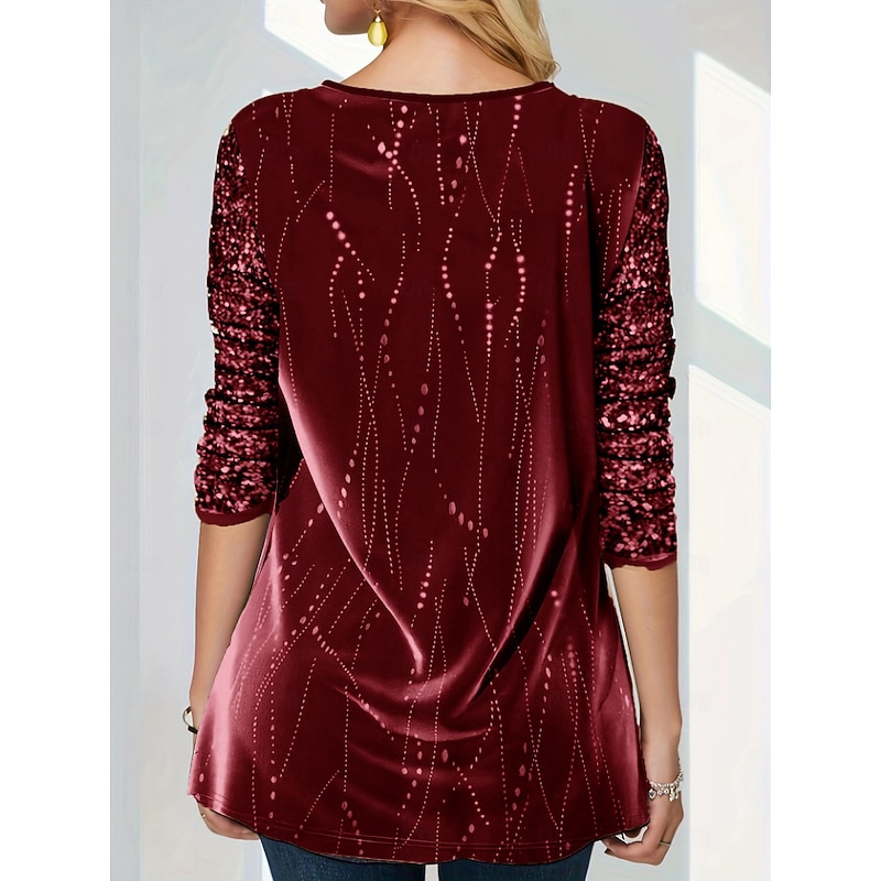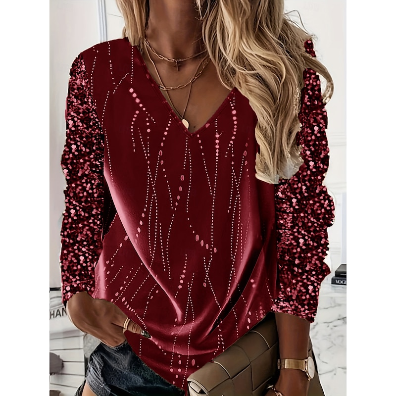 : The blouse features a sophisticated V-neckline and striking graphic sparkly print. Its dazzling sequined sleeves add a touch of glamour and make it an ideal choice for parties and special events. The chic metallic finish adds an extra layer of elegance.