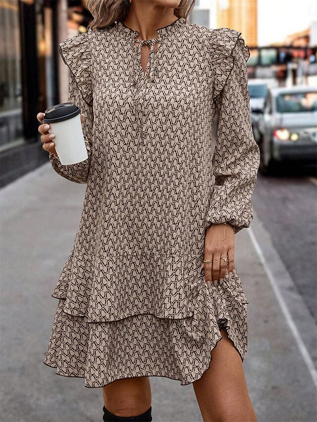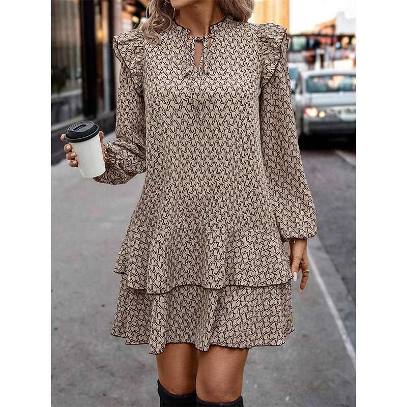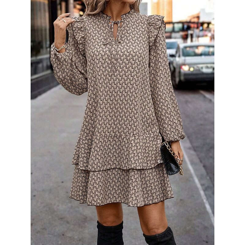 Highlights [Fabric] : Crafted from high-quality polyester, this dress offers a lightweight and breathable feel, making it perfect for all-day wear in spring and fall. [Silhouette] : Featuring a loose, flowing A-line silhouette, this dress combines comfort with style, allowing for ease of movement while maintaining a flattering shape. [Design Highlights] : The dress showcases an elegant geometric pattern, complemented by long sleeves with gentle ruffles at the shoulders for a touch of feminine elegance. A tiered skirt adds layered flair, while the stand collar with keyhole and tie detail enhances its sophisticated look. [Occasions] : Suitable for daily wear, this dress effortlessly transitions from casual outings to more formal occasions, making it a versatile addition to any wardrobe. [Size Range] : Available in sizes S, M, L, and XL, it offers a regular fit, accommodating different body types with its micro-elastic fabric.