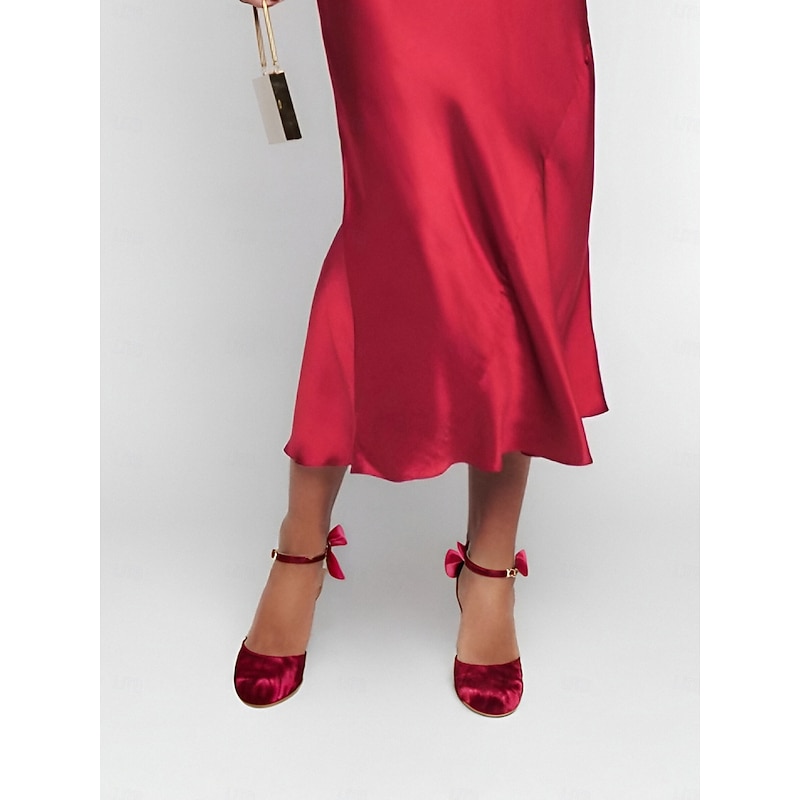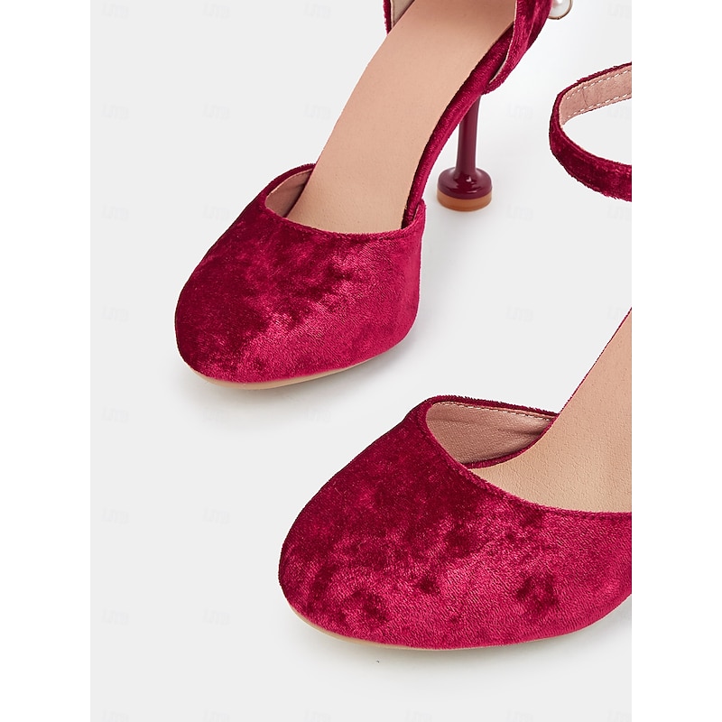 Highlights [Fabric and Style] : Crafted from luxurious velvet, these Mary Jane heels offer both elegance and comfort. The rich burgundy hue delivers a sophisticated and plush aesthetic, making them an excellent choice for evening events or special occasions. [Design Highlights] : These heels are adorned with a chic oversized bow on a slim ankle strap, adding a feminine and playful touch. The kitten heels provide a stylish yet comfortable lift, while the round toe design ensures a flattering fit. Rhinestone and imitation pearl embellishments add a touch of sparkle and charm. [Occasions] : Perfect for weddings, parties, and other special celebrations, these heels effortlessly combine style and comfort, making them suitable for a variety of festive events. Whether it’s a formal gathering or an elegant night out, these shoes add a touch of glamour to any outfit. [Size Range] : Available in a range of sizes from US5.5 to US10.5, ensuring a comfortable fit for most wearers. The standard sizing suggests selecting your usual size for the best fit. [Fabric Information] : These heels feature an upper made from velvet with a synthetic leather lining, providing durability and a luxe feel. The outsole is crafted from foam rubber, offering added comfort and stability.
