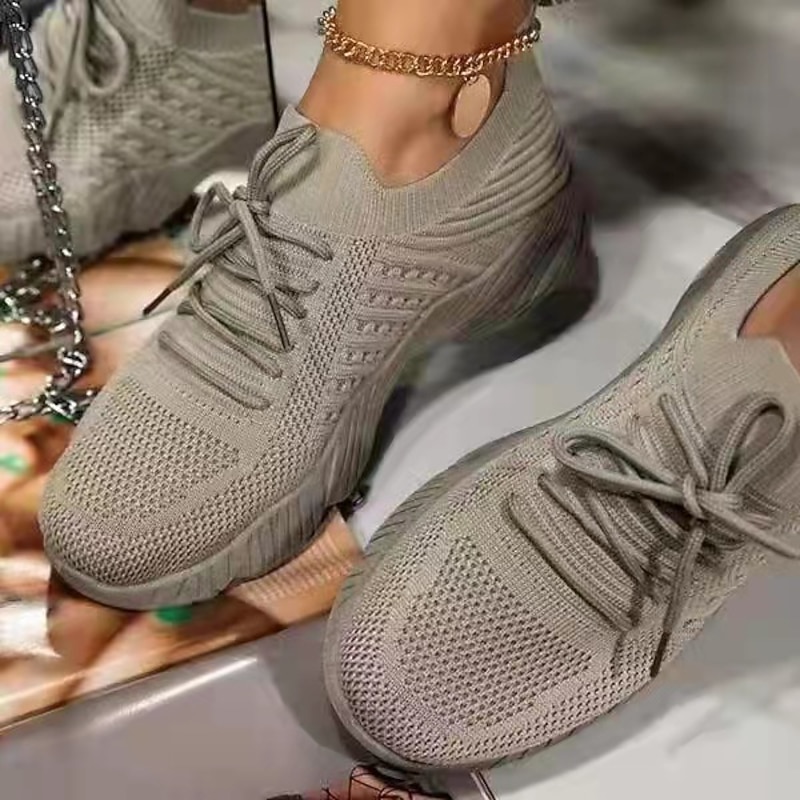 Highlights [Fabric] : Crafted from high-quality flyknit material, these women's sneakers offer superb breathability and a soft, flexible fit, ideal for spring and summer wear. The mesh-like knit ensures excellent ventilation, keeping your feet cool and comfortable throughout the day. [Shape] : Designed with a modern athletic silhouette, these sneakers provide a sleek and stylish appearance. The lightweight construction and streamlined shape make them a perfect choice for those seeking a balance of elegance and sporty charm. [Design Highlights] : Featuring a convenient slip-on and lace-up closure system, these sneakers provide a customizable fit that suits your comfort needs. The round toe shape and shock absorption cushioning enhance overall functionality, while the rubber outsole ensures reliable grip and stability on various surfaces. [Occasions] : Perfectly suited for a variety of activities including walking, running, jogging, and road running. Whether you're headed for a casual outing or engaging in light physical activities, these shoes are a versatile addition to your wardrobe, effortlessly transitioning from sports outdoor occasions to casual settings. [Size Range] : Available in a wide range of sizes from 35 to 43, covering most adult women's feet. The color options include white, black, navy blue, red, blue, pink, grey, and khaki, allowing you to choose the perfect pair to match your personal style.