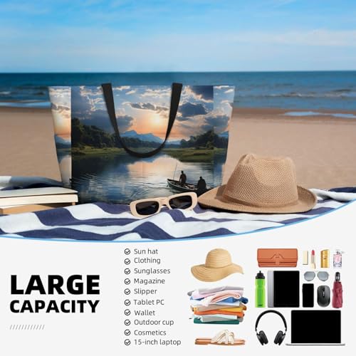 HOT ! Fishing Scenic Beach Bags For Women Large Waterproof Sandproof Beach Tote Bag Pool Bag Lightweight Zipper Carry On Bag For Gym Travel Vocation