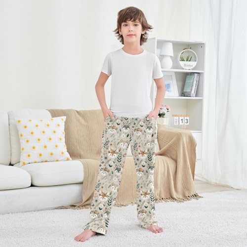 Cute Animals Face and Floral Seamless Pattern Pajamas Bottoms with Pockets Comfy Pjs Sleepwear Elastic Waistband Pajamas Pants Lounge Pants for 6-14 Years 4