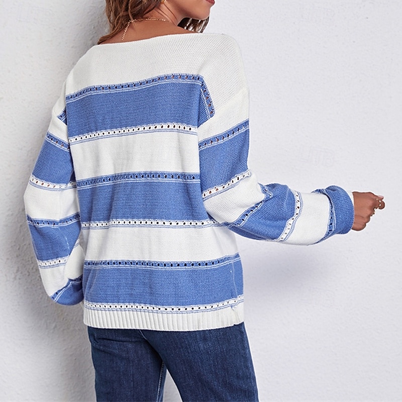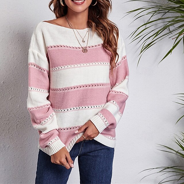 Women's Pullover Casual Striped Chunky Off Shoulder Knitted Long Sleeve Regular Tops Knit Daily Holiday Going out Black Pink Fall Winter 10