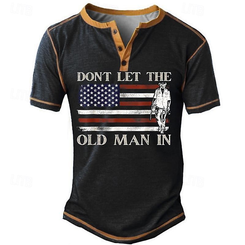 Men's Short Sleeve Henley Graphic T-Shirt - Don't Let The Old Man In American Flag Patriotic Design 1