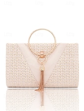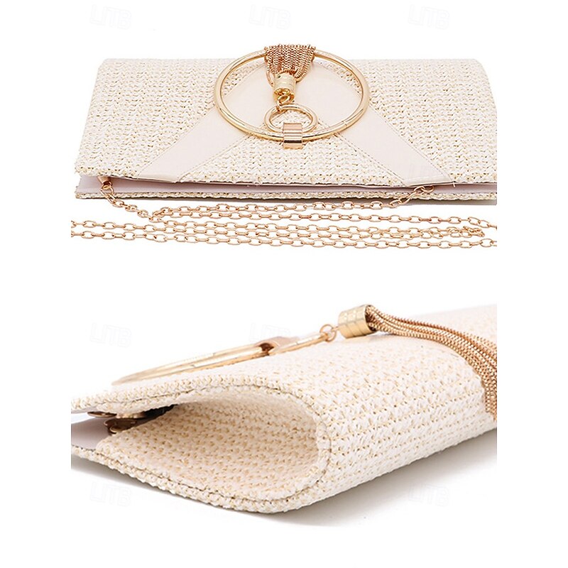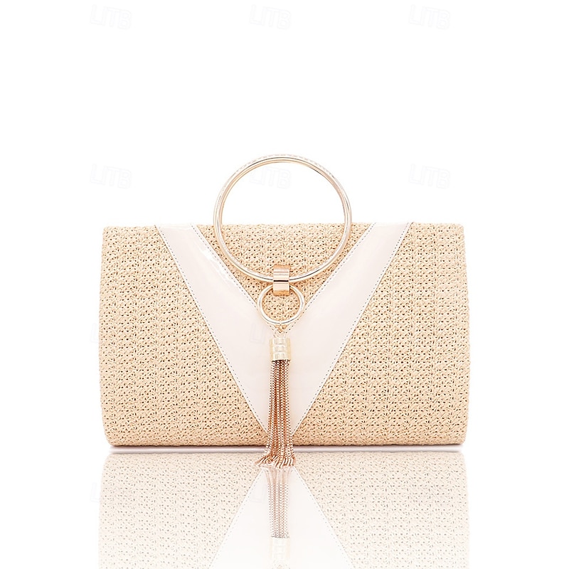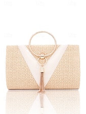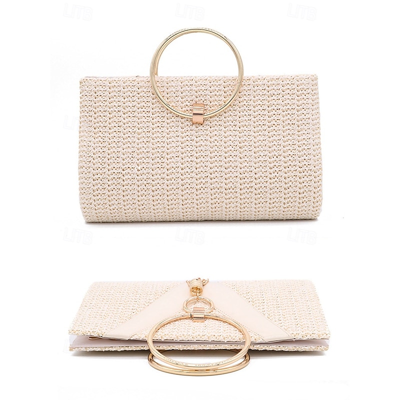 HOT ! Women's Straw Clutch Purse – Elegant Woven Handbag with Gold Ring Handle & Tassel, Boho Chic Evening Bag for Summer, Beach, Vacation, Wedding & Party
