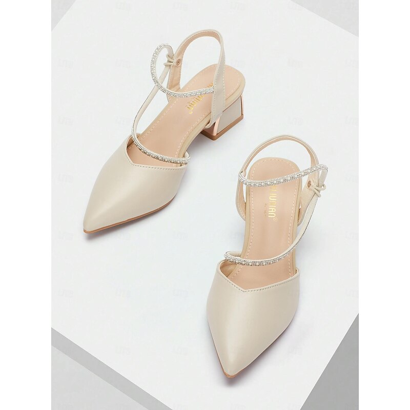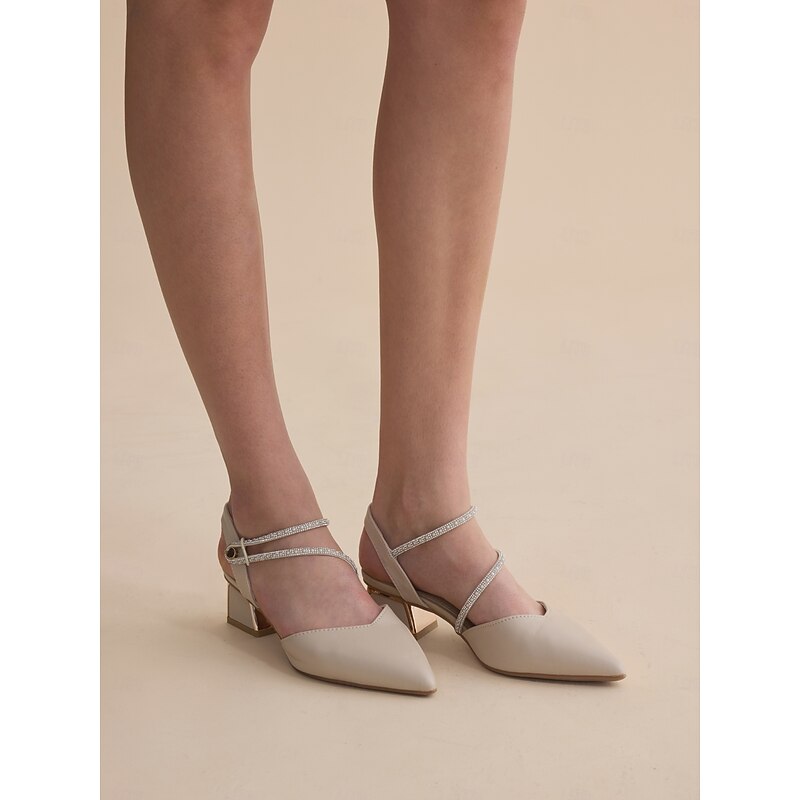 HOT ! Elegant Women's Slingback Pointed Toe Heels with Rhinestone Strap - Beige Mid-Heel Shoes for Weddings and Parties
