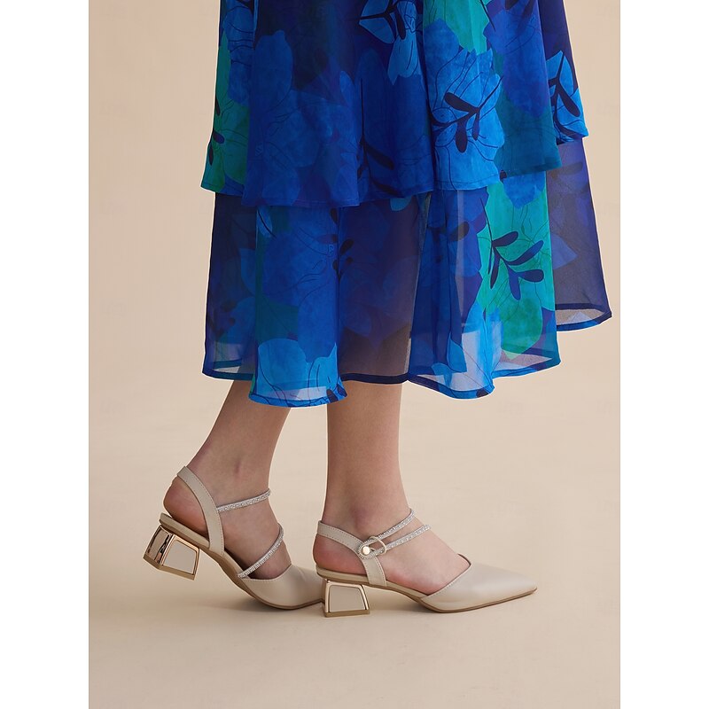 Highlights [Fabric & Materials] : Crafted from high-quality faux leather, these heels offer a smooth and polished look while ensuring durability and comfort for prolonged wear. The material choice complements the rhinestone embellishments, enhancing the overall sophisticated aesthetic. [Design & Silhouette] : Featuring a sleek pointed toe and a secure slingback design, these heels embody a timeless elegance. The mid-height block heel provides both style and stability, making them suitable for extended wear without compromising on elegance. [Design Highlights] : The standout feature of these heels is the delicate rhinestone straps that wrap around the ankle, adding a touch of sparkle and glamour. Additionally, the block heel boasts a reflective metallic finish, elevating the shoe's elegance. [Occasions] : Perfect for weddings, office work, and other formal events, these heels effortlessly combine style and comfort. Whether attending an important business meeting or enjoying a special occasion, these shoes add a vintage charm to any outfit. [Size Range] : Available in sizes ranging from US5.5 / EU35 / UK3.5 to US10.5 / EU42 / UK8.5, these heels accommodate a variety of foot sizes, ensuring the perfect fit for many wearers.
