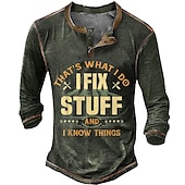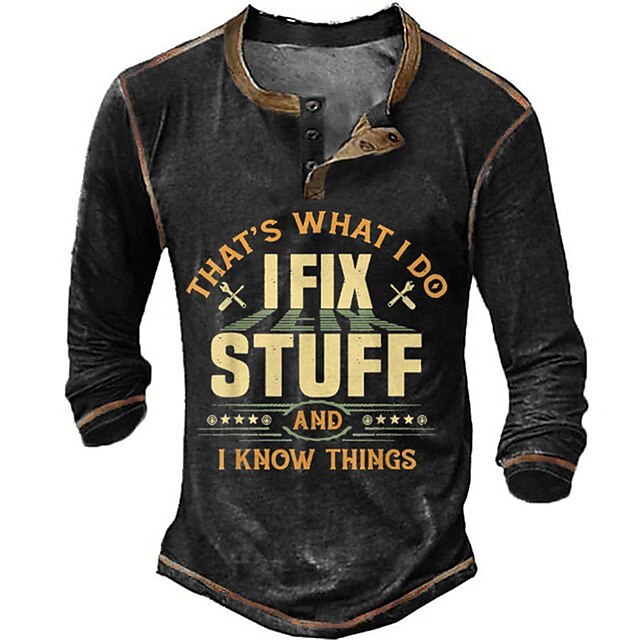 Highlights [Fabric] This stylish men's Henley shirt is crafted from high-quality polyester, providing a comfortable, breathable, and durable fit. The fabric is designed to be micro-elastic, ensuring ease of movement and a soft feel against the skin. [Style] With a regular fit, this shirt offers a relaxed and casual look that is perfect for a variety of occasions. The design includes a button-down Henley neckline and long sleeves, adding to its versatile appeal for daily wear or outdoor adventures. [Design Highlights] The shirt features a unique 3D print graphic and letter design, with a humorous and bold statement on the front that reads "That's What I Do, I Fix Stuff and I Know Things." The contrasting brown trim around the collar and cuffs adds a sophisticated touch, while the vintage, washed-out fabric gives it a rugged and timeless look. [Occasions] Ideal for daily, casual, or outdoor settings, this Henley shirt is suitable for spring and fall seasons. Whether you're attending a laid-back weekend gathering or heading out for a relaxed day, its comfortable and fashionable design makes it a great choice. [Size Range] Available in sizes S, M, L, XL, XXL, and 3XL, this shirt accommodates a wide range of body types, ensuring a perfect fit for everyone.