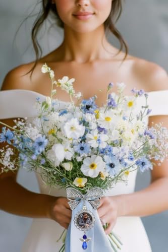 Something Blue Bridal Bouquet Charm Wedding Memorial Bride Shower Gift Wedding Bouquet Memorial for Mother Father DIY Photo Keepsake with Angel Bow Photo Locket 6