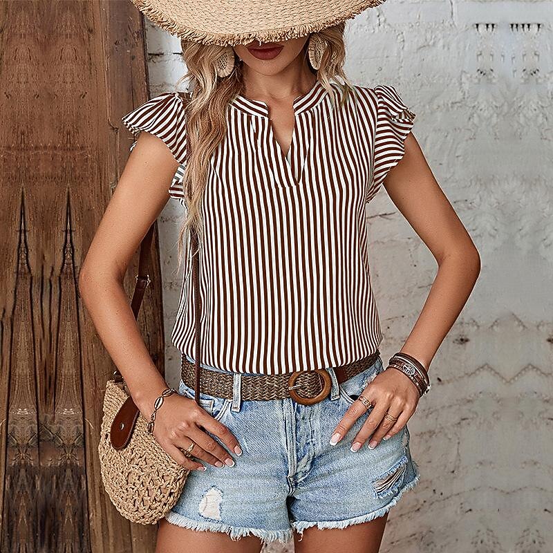 Women's Shirt Blouse Casual Striped Ruffle Print Short Sleeve Regular Tops V Neck Daily Red Navy Blue Blue Brown Green Summer 10