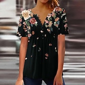 Highlights [Fabric]: Crafted from lightweight and breathable polyester, this women's blouse ensures comfort during warm summer days. The micro-elasticity of the fabric provides a relaxed fit while maintaining its chic appearance. [Fit]: The blouse features a regular fit that is both comfortable and flattering, making it suitable for a wide range of body types. Its short sleeves and regular top length make it an ideal choice for summer wear. [Design Highlights]: Adorned with a sophisticated and vibrant floral print, the blouse is enhanced with a charming crew neckline. The design includes small buttons that add a subtle yet stylish touch, perfect for elevating any ensemble. [Occasions]: Ideal for daily wear and vacation outings, this blouse offers versatility and style. Pair it effortlessly with jeans or skirts for a casual yet chic look, suitable for both relaxed and more festive settings. [Size Range]: Available in a variety of sizes, from S to 3XL, ensuring a comfortable and tailored fit for different preferences and body shapes.