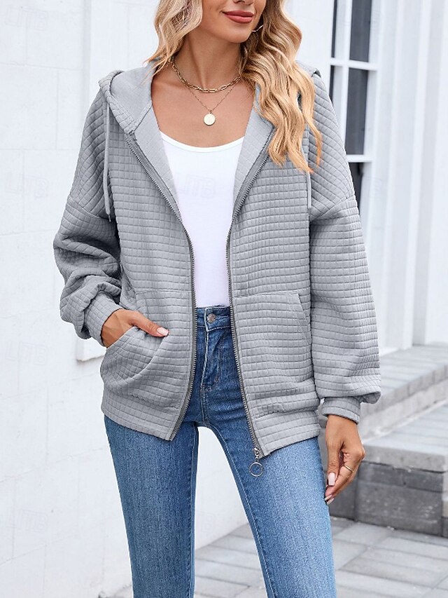 Women's Texture Sweatshirt Waffle Sweatshirt  Zip Up Hoodies Plain Casual Long Sleeve Hooded Regular Tops Street Holiday Going out Zipper Pocket Black Pink Brown Khaki Dark Gray Fall Winter 22