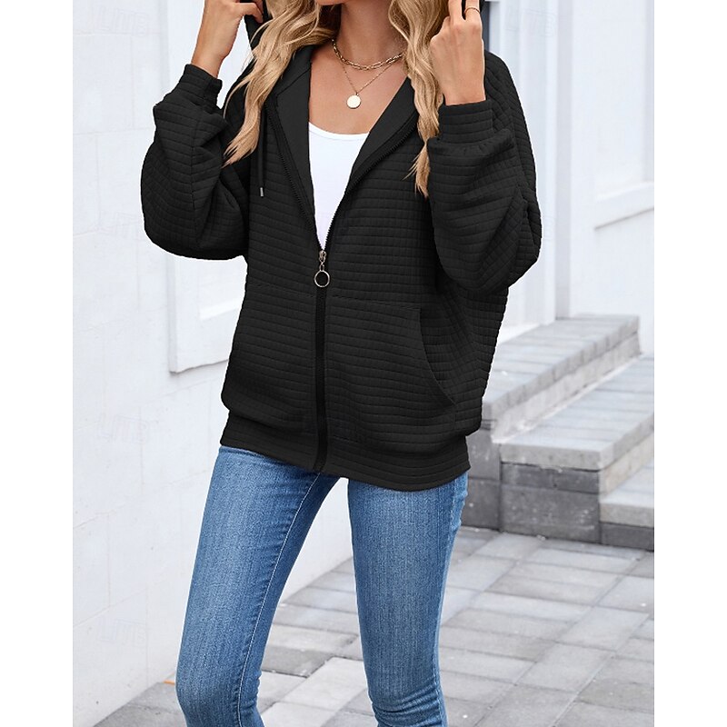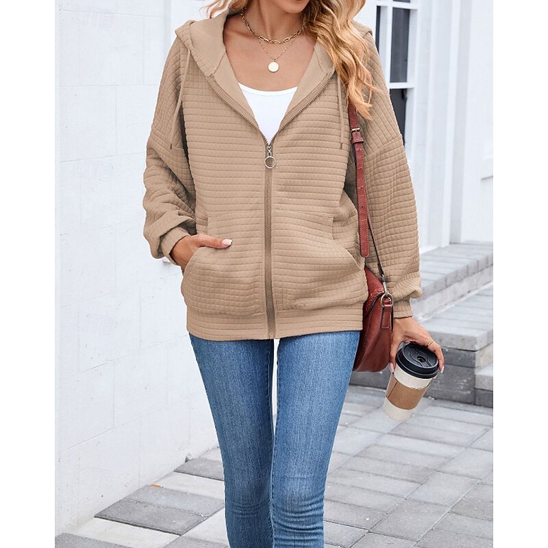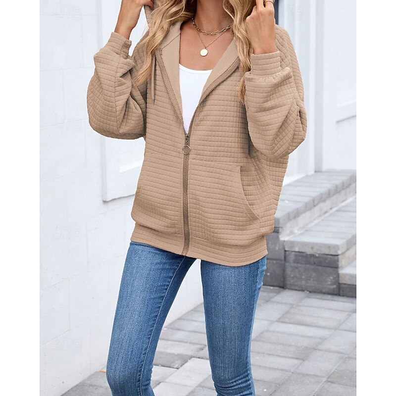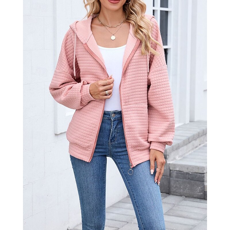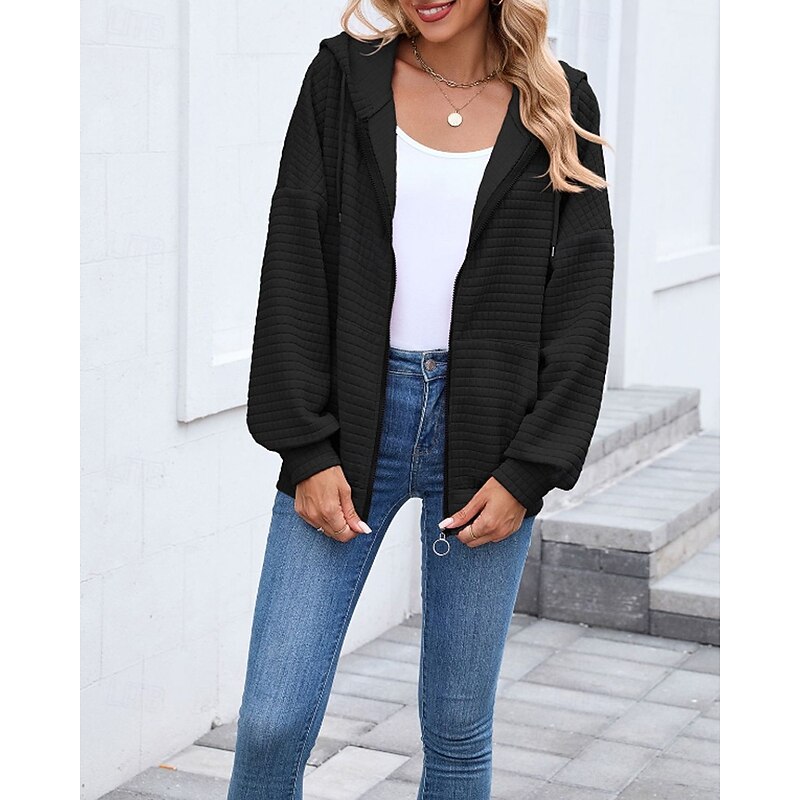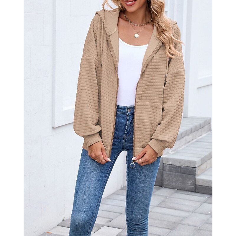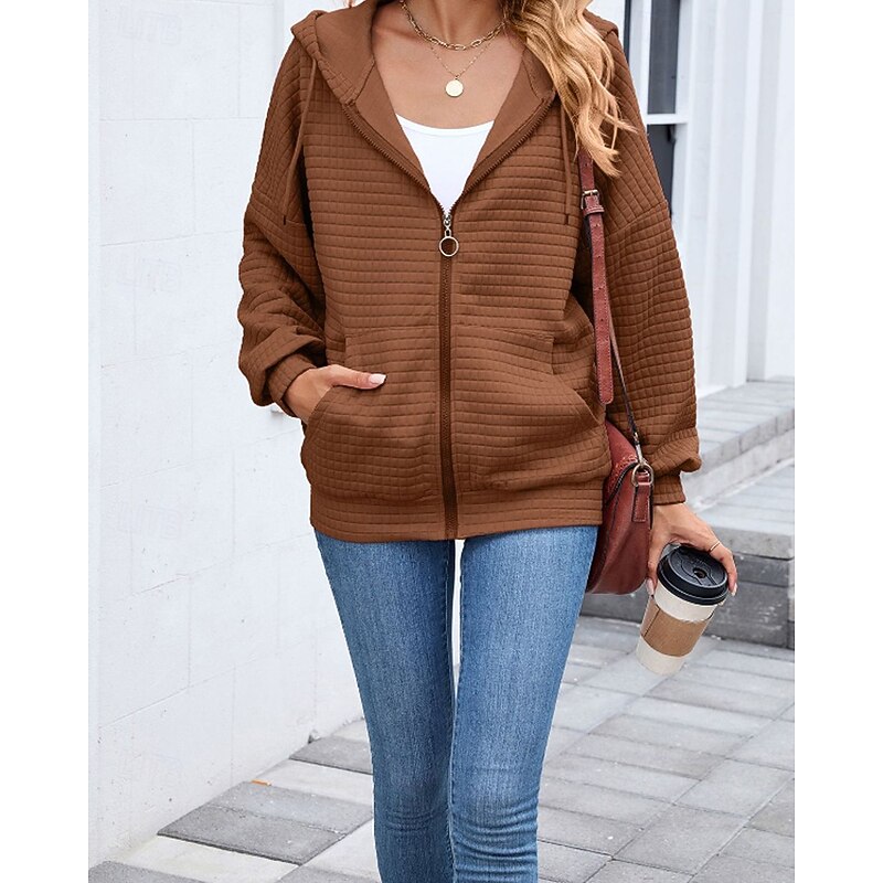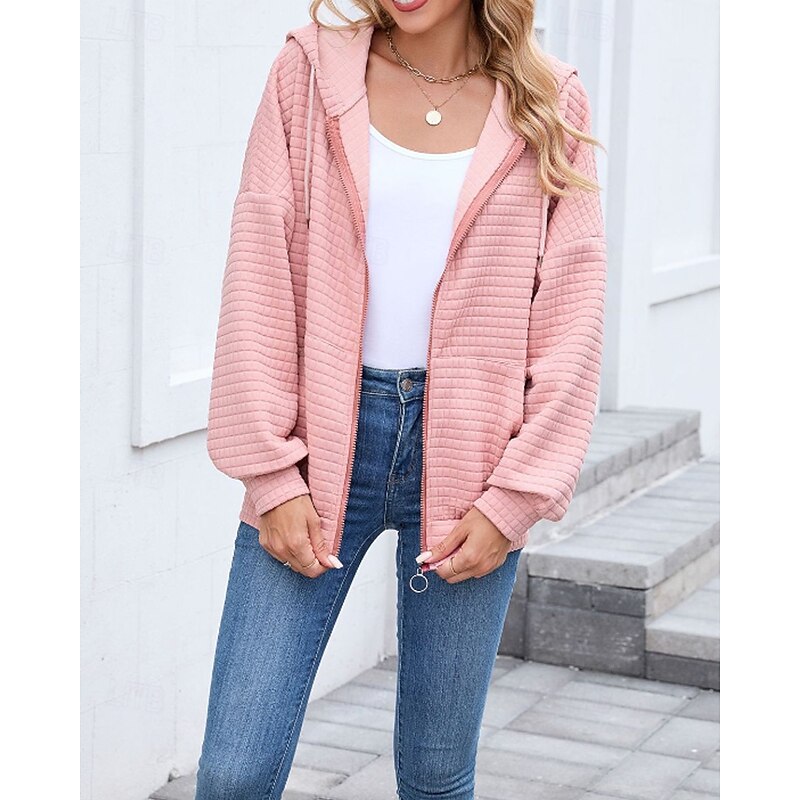 Women's Texture Sweatshirt Waffle Sweatshirt  Zip Up Hoodies Plain Casual Long Sleeve Hooded Regular Tops Street Holiday Going out Zipper Pocket Black Pink Brown Khaki Dark Gray Fall Winter 25