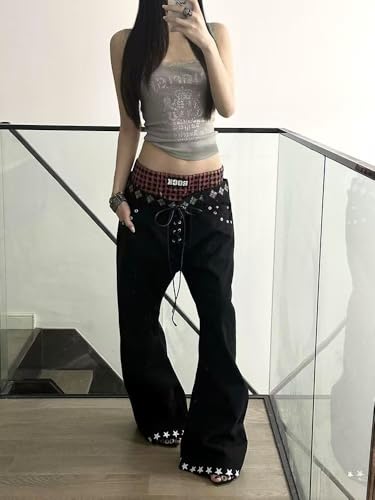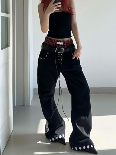 More information about Unisex Y2k Grunge Gothic Plaid Double Waistband Tie Jeans Harajuku Streetwear Punk Rock Star Print Baggy Denim Pants
