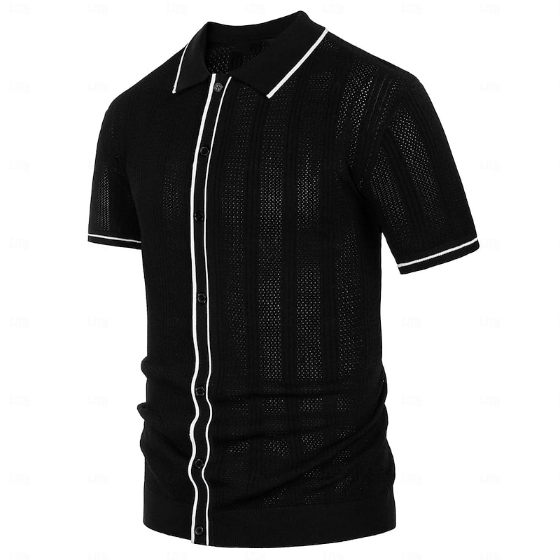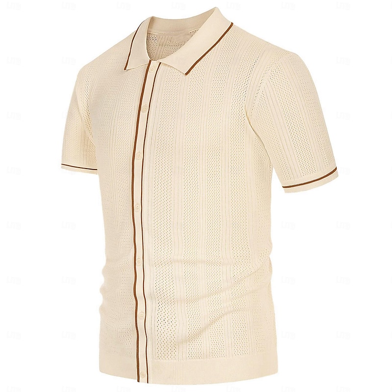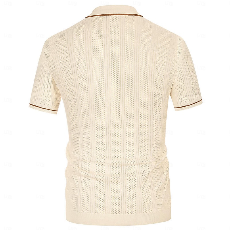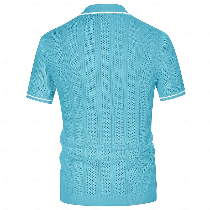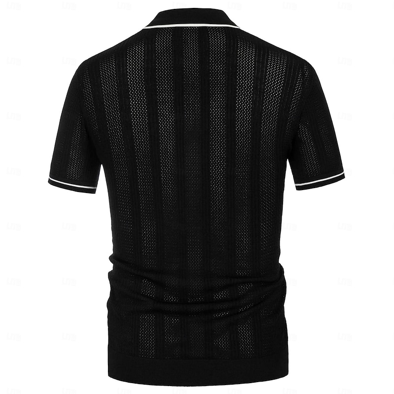 Crafted from a lightweight, breathable knit fabric, this men's polo shirt features a subtle vertical striped pattern with a slightly textured, perforated design. This enhances airflow, making it an ideal choice for warm weather. The fabric offers comfort while maintaining a polished appearance, suitable for both casual and business settings.