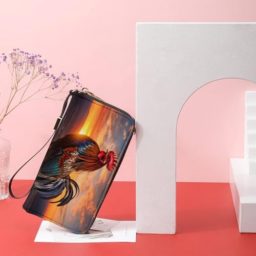 Rooster Leather Wallet Fashion Bifold Purse Long Pouch with Wrist Strap for Men Women 1
