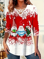 HOT ! Women's Tunic Top V-Neck Snowflake Gnome Print Long Sleeve Casual Holiday Wear Red White Stretch Fabric Relaxed Fit Comfortable Seasonal Shirt