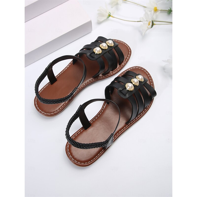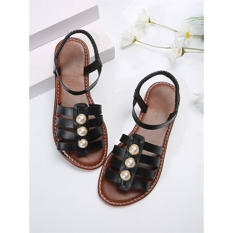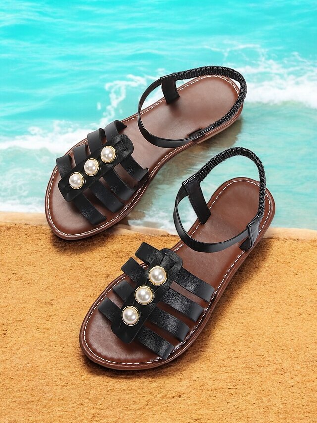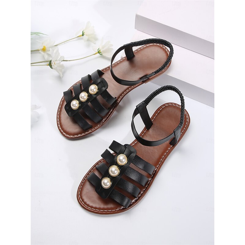 HOT ! Black Gladiator Sandals with Imitation Pearl Embellishments for Women – Elegant Summer Footwear